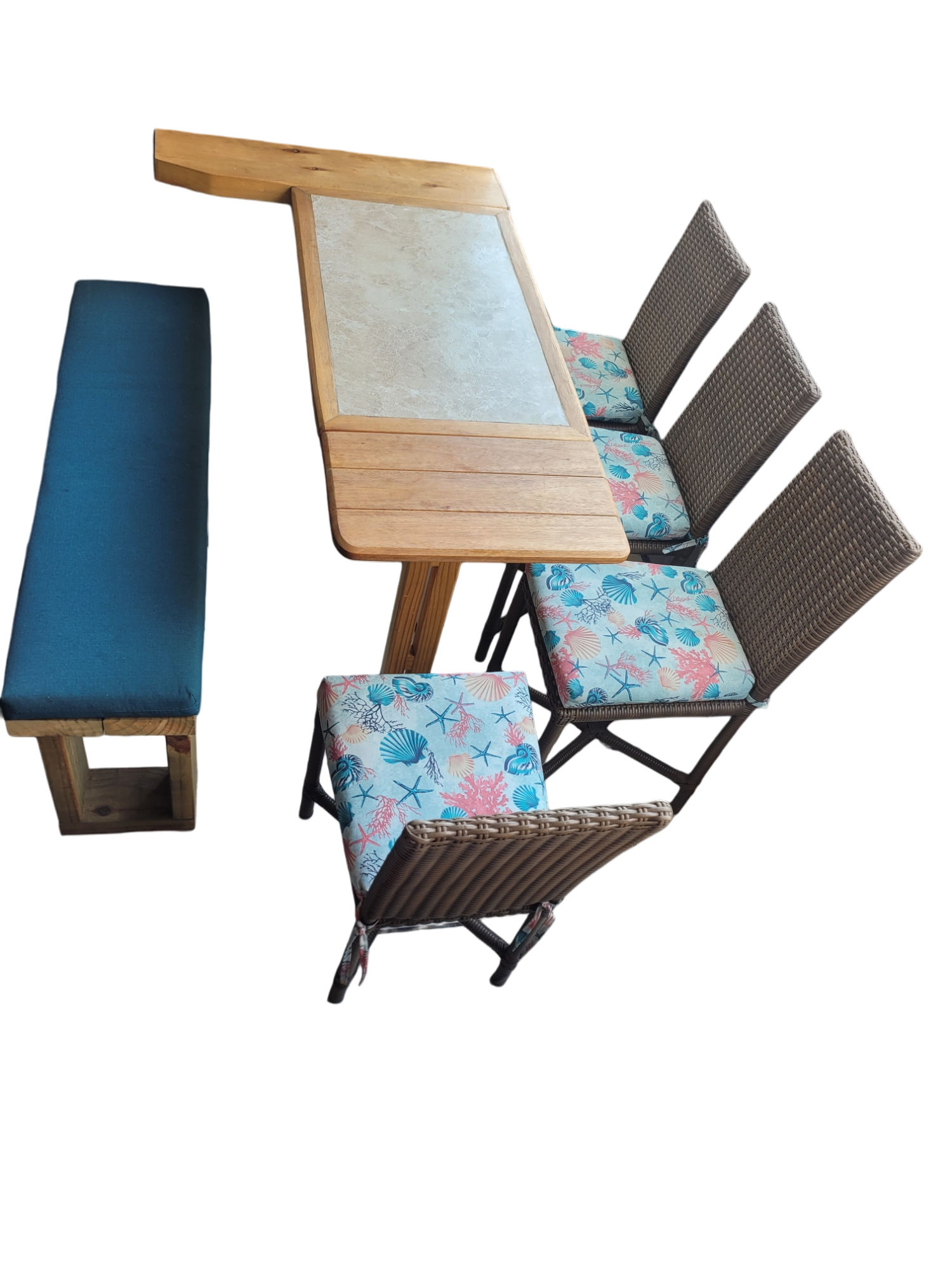 Feita de madeira maciça, a mesa possui uma qualidade superior, beleza natural, e durabilidade que esse material pode garantir, ainda recebe acabamentno de alta qualidade que garante a máxima proteção que existe no mercado, como a dada à decks, cercas, grades, portões, que são e expostos 24hs as intempéries do tempo, sol, chuva, maresia, água colorada etc.